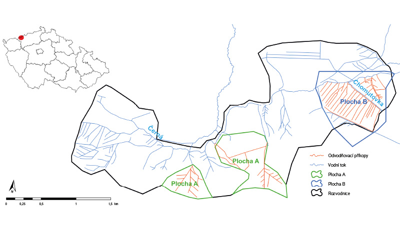 Obr. 1. Schéma monitorovacích ploch A a B (plocha A vlevo odpovídá rozvodnici pro profil V1-CH1, viz obr. 2); rozvodnice vodního toku Chomutovka v řadě případů nerespektuje sklonové poměry povodí díky odvodňovacím kanálům, proto je rozvodnice do jisté míry založena na terénním průzkumu a následném expertním odhadu