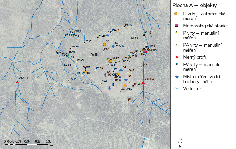 Pro kompletní monitoring v ploše A (obr. 2) byl využit systém stávajících vrtů řad P, PA a PV, v nichž se dvakrát ročně manuálně měří hladina podzemní vody, její teplota a konduktivita. Dále zde byly zřízeny vrty řady D1 až D5, kde se nacházejí tlakové sondy pro kontinuální měření výšky hladiny a teploty podzemní vody. Vybrané vrty, např. D2 a D5, byly instalovány jako zdvojené – jeden zasahoval pouze do svrchní vrstvy rašeliny (akrotelmu), zatímco druhý pronikal do spodní vrstvy (katotelmu). Vrty D1 a D3 slouží zároveň k měsíčním odběrům vody pro laboratorní chemické analýzy.