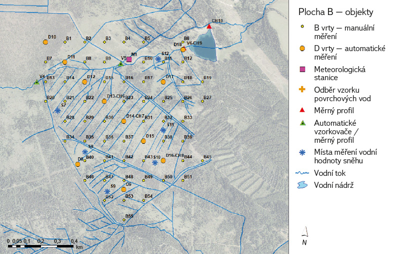 Na ploše B (obr. 3) byl hydrologický monitoring výrazně rozšířen – zřízeno zde bylo 55 mělkých vrtů řady B s hloubkou maximálně do 3 m, rozmístěných v pravidelném rastru pokrývajícím revitalizovanou i nerevitalizovanou část rašeliniště. Kromě toho byly instalovány vrty řady D8 až D18, z nichž D11, D14 a D16 byly rovněž zdvojené pro srovnání hladin mezi akrotelmem a katotelmem. Vrty D8, D14 a D16 slouží i pro odběry vzorků a jejich chemickou analýzu. Tato pozorovací síť poskytuje podrobnou informaci o hydrologických poměrech v ploše rašeliniště.