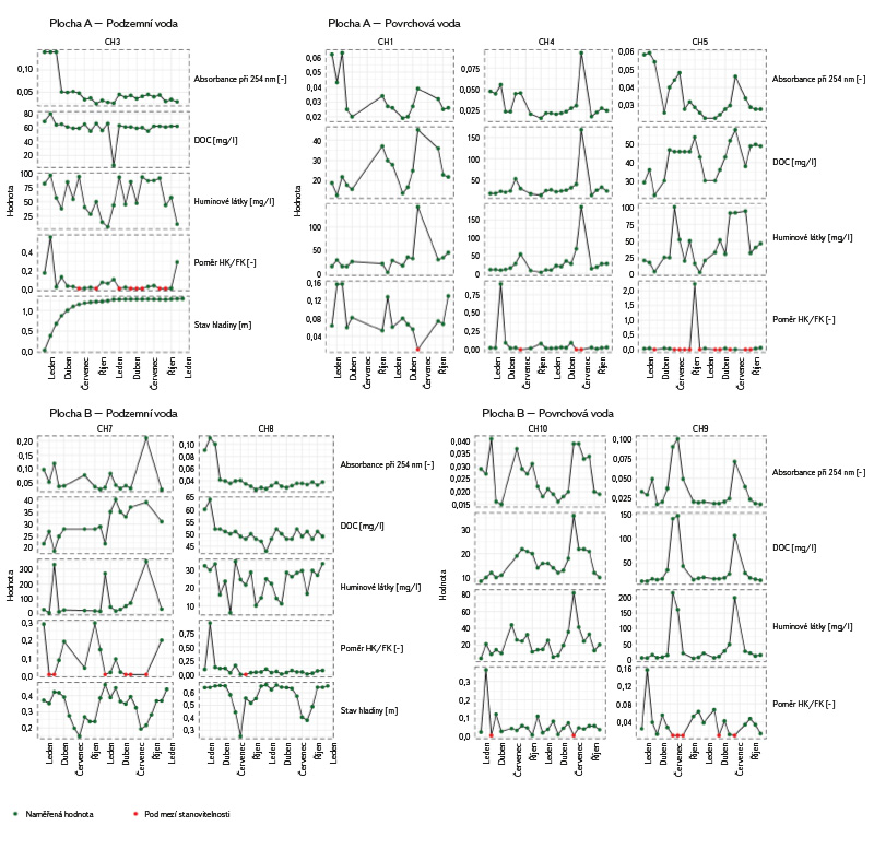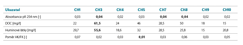 Následující výsledky jsou založeny na dvouletém vzorkování v měsíčním kroku. Ze všech pozorovaných chemických ukazatelů je v tomto článku pozornost zacílena na HL a s nimi spojené ukazatele přítomnosti organických látek ve vodě (poměr huminových kyselin a fulvokyselin – HK/FK, rozpuštěný organický uhlík – DOC a absorbance při 254 nm – A254). Na obr. 5 jsou vyobrazeny výsledky pro odběrová místa povrchových a podpovrchových vod CH1–CH10. Z vyhodnocení jsou vypuštěny lokality (vrty) CH2 a CH6, a to z důvodu velmi nízkého počtu odebraných vzorků kvůli nepřítomnosti vody ve vrtech. Z výsledků je patrná sezonnost obsahu HL v povrchových vodách, kdy v letních měsících za nízkých průtoků roste jejich koncentrace. Naopak v podzemních vodách nedochází k tak výrazným výkyvům a sezonnost není patrná. Pouze vrt CH7 zaregistroval tři vyšší hodnoty, které však byly zaznamenány při velmi nízkém stavu hladiny podzemní vody, což mohlo způsobit odebrání kalu ze dna vrtu. Obecně jsou v podzemní vodě koncentrace HL vyšší během celého roku, kromě letních měsíců, kdy v povrchových vodách rostou koncentrace nejen organických látek, ale dle provedených rozborů také kovů (Fe, Al) a celkového dusíku [13]. Podobně se vyvíjejí i další ukazatele vázané na přítomnost organických látek ve vodě (DOC a A254). Pokud porovnáme průběh koncentrací v povrchových vodách z revitalizovaných (CH5) a nerevitalizovaných území (CH9 a CH10), profil CH5 vykazuje vyšší minimální koncentrace HL a celkově vyšší rozkolísanost hodnot během roku a zároveň nižší maxima v letních měsících. Naproti tomu profil CH9 má ustálené nižší minimální hodnoty v zimní části roku, v létě však dosahuje až dvojnásobně vyšších koncentrací HL. To způsobuje, že průměrné hodnoty za celé sledované období jsou z obou profilů celkem vyrovnané (tab. 1): CH5 – 41,5 mg/l, CH9 – 40,7 mg/l. Nicméně právě velikost průtoku při odběrech má významný dopad na celkové množství vyplavených organických látek. Nejvyšších průtoků je zpravidla dosaženo během zimy při tání sněhu. Zatímco u profilu CH9 se v tomto období koncentrace pohybují do 25 mg/l, na profilu CH5 jsou koncentrace i dvojnásobné. Naopak vyšší koncentrace na profilu CH9 jsou zaznamenány při velmi nízkých průtocích kolem 1 l/s a méně. To má za následek, že celkově se vyplavuje více organických látek z revitalizovaného území. Vyšší koncentrace v revitalizovaném území jsou však v porovnání s nerevitalizovaným územím dosahovány i za vyšších průtoků a ve vlhčím období, kdy zatížení vodního toku vyšší koncentrací HL je rychle eliminováno dalšími přítoky s nižším obsahem HL. Dle rozborů prováděných v rámci souběžně zpracovávané bakalářské práce [14] docházelo na přibližně 5 km dlouhém úseku toku Chomutovky k poklesu koncentrace HL i o více než 80 %. Pro zmírnění vlivu ojediněle se vyskytujících odlehlých naměřených hodnot jsou v tab. 2 zobrazeny hodnoty mediánů: CH5 – 32 mg/l a CH9 – 15 mg/l.