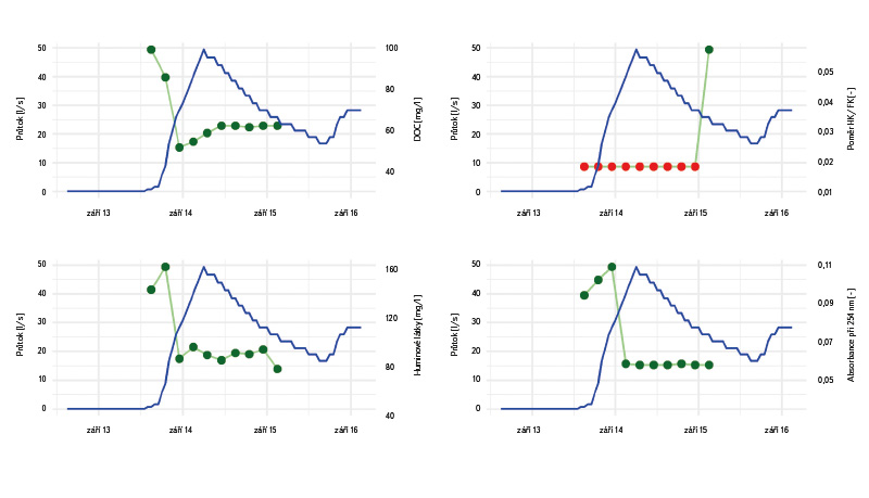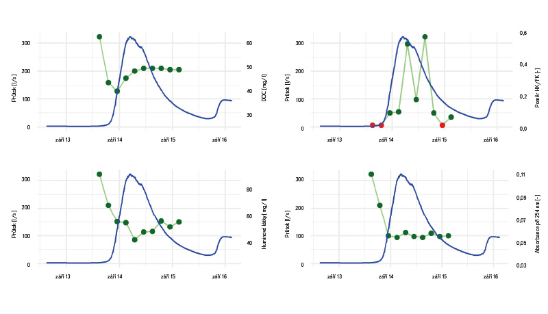Obr. 7. Výsledky automatického vzorkování významné srážkoodtokové události 13. až 15. září 2024 na profilu V4