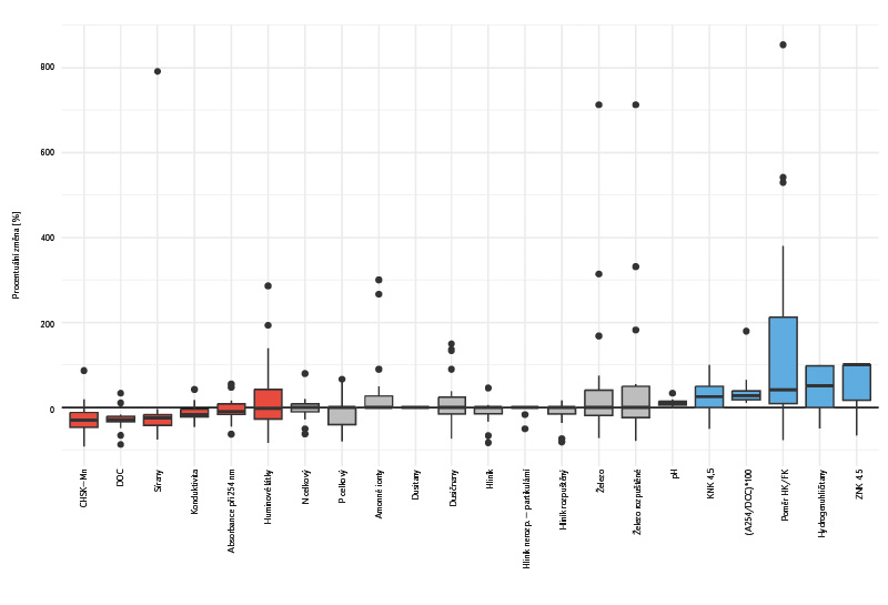 Obr. 9. Krabicové grafy procentuálních změn obsahu látek mezi profily CH9 nad nádrží a CH10 pod nádrží; hlavní částí je „krabice“ mezi prvním a třetím kvartilem, uvnitř níž je čára označující median; z krabice vycházejí „vousy“, jež zobrazují rozsah dat mimo kvartily (typicky až 1,5násobek interkvartilního rozpětí); odlehlé hodnoty jsou zobrazovány jako samostatné body mimo vousy