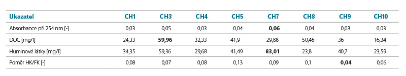 Tab. 2. Hodnoty mediánů sledovaných chemických ukazatelů; tučně jsou vyznačeny nejhorší výsledky z pohledu kvality vody