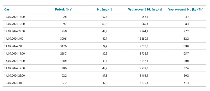 Tab. 3. Vypočtené množství odplavených HL při významné srážkoodtokové události 13. až 15. září 2024 na profilu V5