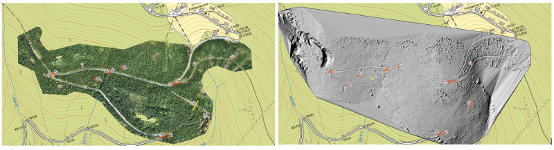 V prvním návrhu základní úrovně typologie byly jako klíčové charakteristiky zvažovány i existence prvků podélného odvodnění a terénní konfigurace – poloha cesty vůči okolnímu terénu. Tyto charakteristiky nelze sice vyčíst z běžných datových podkladů, ale v rámci řešeného projektu byly testovány postupy pro analýzu podrobných DMT pořízených technikami leteckého laserového skenování, jež se stávají v posledních letech stále dostupnější. Pro analýzu pilotních lokalit vybraných v rámci řešení projektu byl k dispozici DMT z roku 2012 v rozlišení 100 cm dodaný Správou KRNAP a DMT s prostorovým rozlišením 50 cm pořízený vlastními prostředky UAV. V obou případech šlo o produkty laserového skenování. Analyzováno bylo přibližně 20 příčných profilů ve dvou lokalitách, příklad lokality pod Špindlerovkou včetně polohy zkoumaných profilů ukazuje obr. 1.