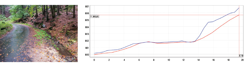 Analýzy těchto příčných profilů se pro získání informací o terénní konfiguraci cestního úseku, případně o objektech podélného odvodnění, ukázaly jako podmíněně použitelné. Na obr. 2 je zachycen asi nejzřetelnější z analyzovaných příčných profilů v pilotní lokalitě pod Rennerovkami. Na metrovém digitálním modelu cestní příkopy většinou rozeznatelné nejsou, v případě detailnějšího rozlišení obvykle ano. Nezřídka je však těžké je identifikovat v šumu způsobeném relikty zpracování výškopisných dat. Terénní konfigurace cesty byla většinou uspokojivě patrná i na méně podrobném metrovém modelu, standardní dvoumetrový model DMR5G publikovaný službami ČÚZK už však na tuto úlohu nestačil.