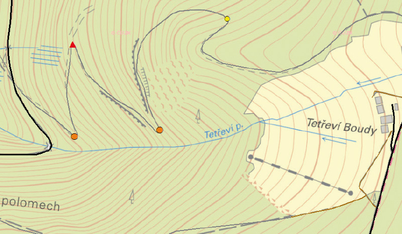 Obr. 3. Ostrý zlomový bod (červený trojúhelník) a tři výrazné oblouky (oranžové a žlutý kruh) jako dělicí body linie přístupové cesty k Tetřevím boudám