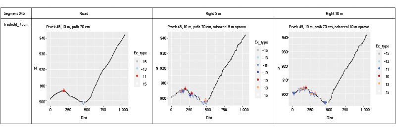 Kvůli prověření potenciálních chyb ve směrovém vedení cest byla stejná analýza zopakována pro rovnoběžné linie po obou stranách cest s odstupem 5 a 10 m. Automaticky generované grafy podélných profilů byly systematicky vizuálně analyzovány ve skupinách, jednu z nich ukazuje obr. 4. Tento přístup prokázal dostatečnou přesnost směrového vedení linií cest ve srovnání s jejich ekvidistantami. Jako ideální pro tvorbu podélných profilů se ukázala odlehlost bodů 10 m a výškový práh 70 cm. Na závěr byly opět odstraněny body v blízkosti uzlů cestní sítě a ošetřen byl výskyt blízkých opačných extrémů.