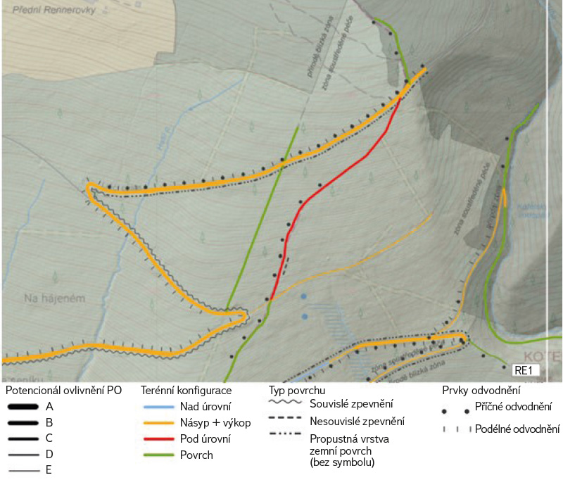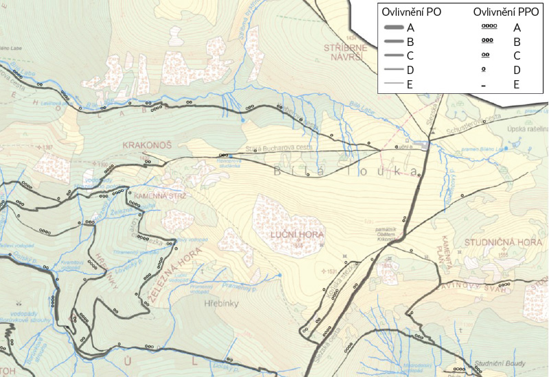 Nástroji databázového zpracování byla vektorovým úsekům cestní sítě přiřazena hodnota charakteristik určujících význam daného úseku pro ovlivnění povrchového i podpovrchového odtoku dle zpracované Typologie cestní sítě. Po zatřídění každého úseku do kombinovaných kategorií (PO a PPO) byla vytvořena finální Mapa pro celé území KRNAP. S ohledem na rozsah a detaily zobrazovaných informací byla Mapa uspořádána do atlasu mapových listů v měřítku 1 : 25 000. Potenciál ovlivnění povrchového odtoku byl zobrazen pomocí proměnlivé tloušťky linie, potenciál ovlivnění podpovrchového odtoku je pak vyznačen pomocí jednoduchého doprovodného popisku. Příklad mapového listu je na obr. 5.