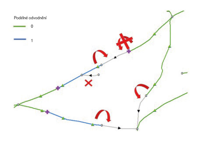Obr. 6. Schéma přenesení příznaku podélného odvodnění do sousedních úseků se zohledněním specifických bodů (fialové křížky) se zaznamenanou změnou podélného odvodnění; zelené trojúhelníky jsou charakteristické body