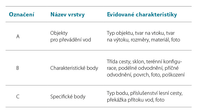 Tab. 3. Bodové vrstvy pro sběr terénních dat a evidované charakteristiky