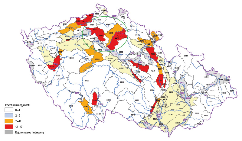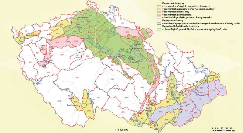 V roce 2005 byla zpracována poslední verze hydrogeologické rajonizace (obr. 2) [11], která je platná až do současnosti. Aktualizované rajony se značně přiblížily vymezeným útvarům podzemních vod. V rámci rajonizace je v ČR vyčleněno 152 HGR, z toho 111 v základní vrstvě, jež pokrývá celou republiku, tři rajony jsou ve vrstvě bazálního křídového kolektoru (v severozápadní části české křídové pánve) a 38 rajonů je vymezeno ve svrchní vrstvě (kvartérní a neogenní sedimenty, Jizerský coniak). Odběry podzemních vod jsou přiřazeny k těmto rajonům při zohlednění typu hydrogeologické struktury (např. pánevní struktury, hydrogeologický masiv, kras, flyš, kvartér, neogén). HGR vesměs odpovídají členění na útvary podzemních vod pro potřeby plánů oblastí povodí a jsou jednoznačně přiřazeny k jednotlivým oblastem povodí. Znamená to tedy, že HGR jsou vždy hodnoceny jako celek, i když podle hranic správních území by měly být rozděleny. Výjimkou jsou HGR 6320 (Horní Vltava/Dolní Vltava) a HGR 2250 (Morava/Dyje), které jsou rozděleny mezi dvě dílčí povodí podle – v nich vymezených – čtyř vodních útvarů. Dva vodní útvary spadají do jednoho a druhé dva do jiného dílčího povodí. Tím je zachováno hodnocení podzemních vod pro potřeby plánů povodí i vodohospodářské bilance vždy v rámci celého dílčího povodí jako celku.