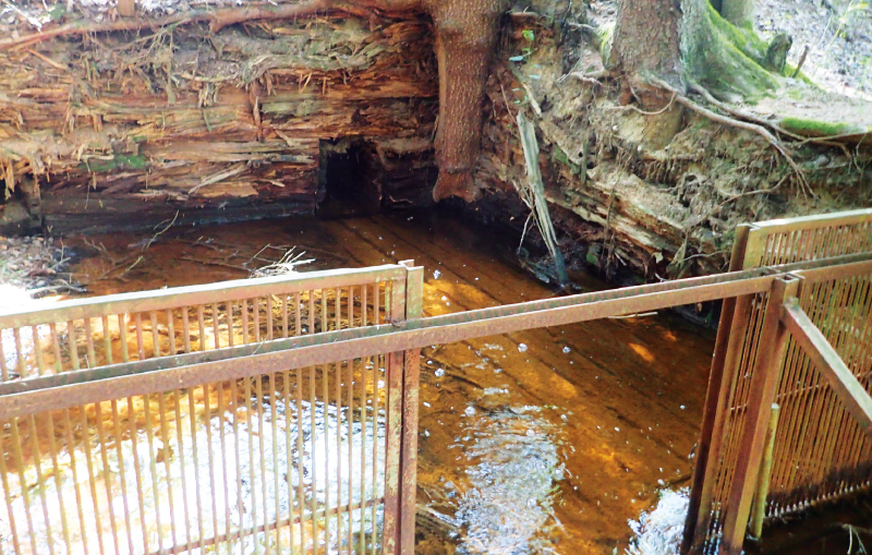 Fig. 3. Remains of a wooden outlet pipe at Huťský Pond (photo: M. Bureš, July 2024)