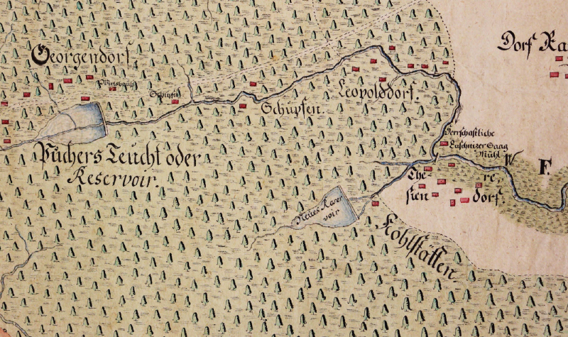 Obr. 7. Situace na horním toku Černé ve druhé polovině devadesátých let 18. století; mapa zachycuje Leberhartský rezervoár (zdroj: Státní oblastní archiv v Třeboni, oddělení Třeboň, Velkostatek Nové Hrady, mapa č. 2 759)