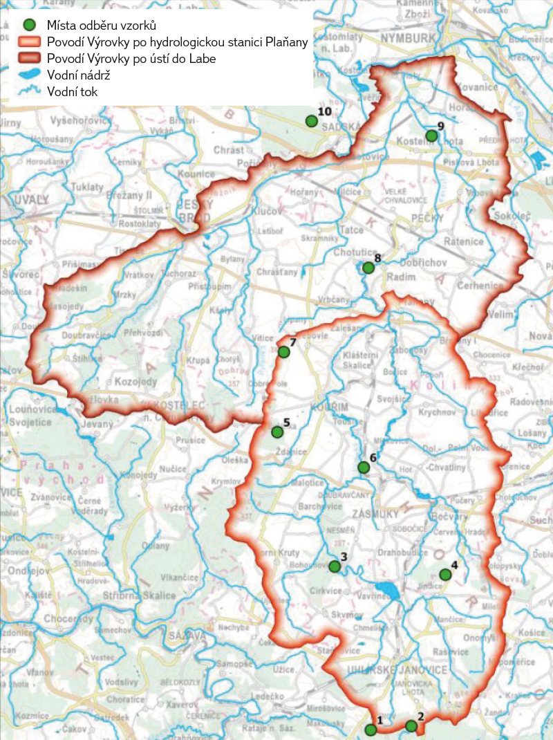 Pilotní povodí Výrovky s vyznačenou vodoměrnou stanicí a místy odběrů vzorků jednotlivých matric jsou na obr. 1.