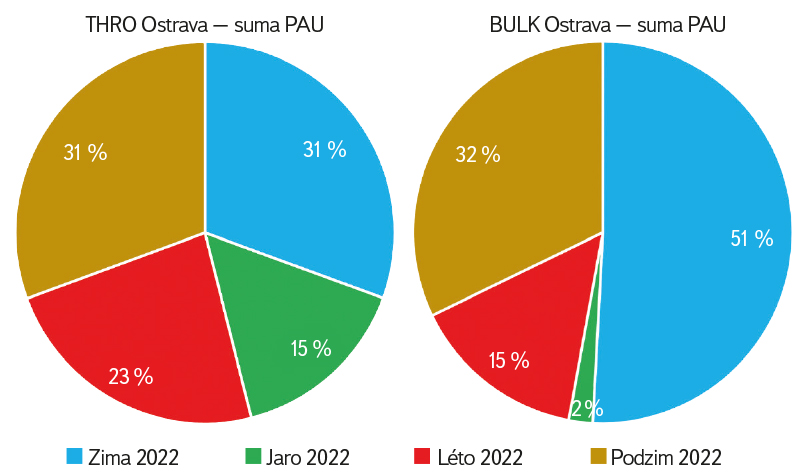 Porovnání stejné matrice na výrazně více zatížené lokalitě v Ostravě též shrnuje obr. 15. Na rozdíl od Třebovle je zde menší vliv sezony v případě pyrogenních PAU a naopak petrogenní PAU byly přítomny pouze v topné sezoně a v září 2023, které bylo teplotně podnormální. Rozdíly souvisejí s větším průmyslovým zatížením, velikostí aglomerace a pravděpodobně i s častější manipulací s palivy.