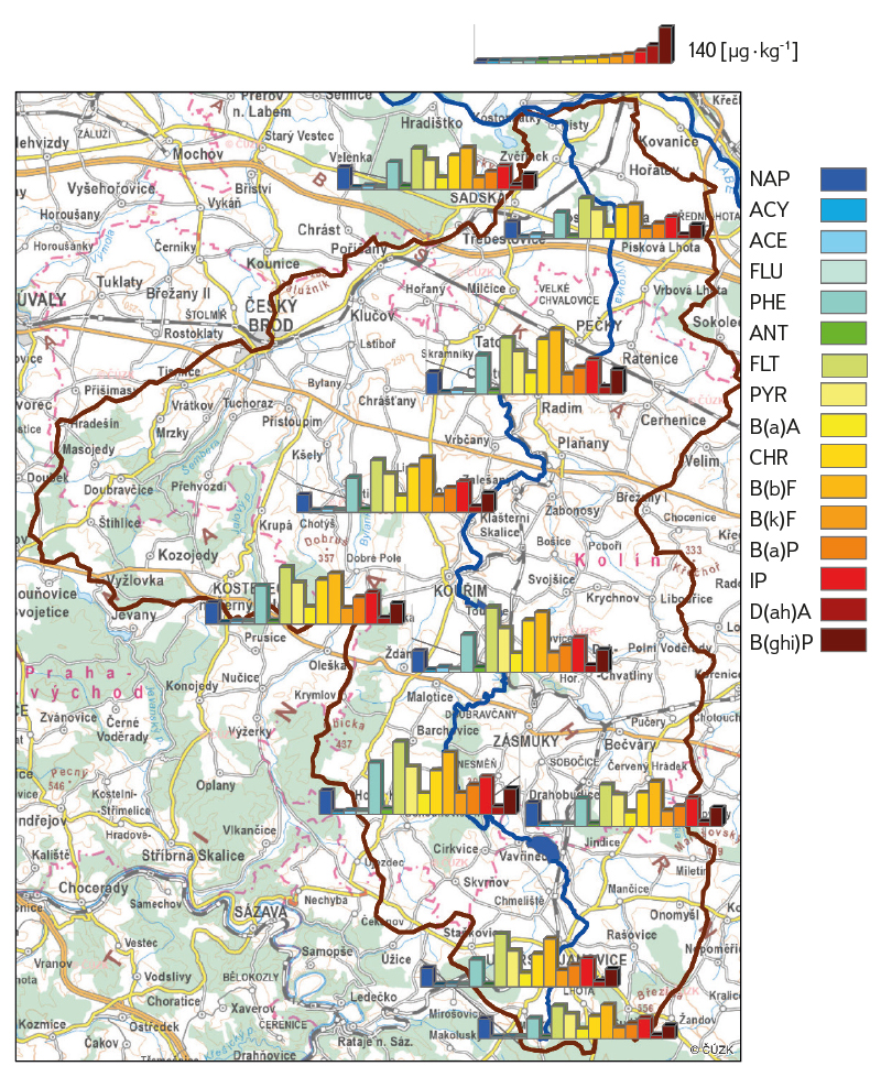 V mechu nejvyšší relativní podíl na sumě PAU měly NAP, FEN, FLT, PYR a BBF a nejmenší ANT, ACY a ACN. V roce 2021 byly nejvyšší sumy PAU v mechu naměřeny u vzorků z blízkých lokalit 3 a 4 v jižní polovině povodí (obr. 1). Velký počet případů vysokých koncentrací jednotlivých PAU byl zjištěn i u mechu z lokality 7 s indikovanými vyššími spady těžkých kovů (TK). Naopak nejnižší sumy PAU byly naměřeny v mechu na vzájemně vzdálených lokalitách 5 a 9. V roce 2022 byly zjištěny nejvyšší sumy PAU u vzorků mechu z lokalit 4 a 2 z jižní části povodí Výrovky a nejnižší sumy pro lokality 10 a 6 v severní a střední části povodí. Sumy PAU v mechu v roce 2022, který byl v ročním průměru o 2 °C teplejší proti roku 2021, byly o 60 % vyšší než v roce 2021, největší nárůst byl zjištěn pro NAP. S růstem teploty se ovšem sorpce PAU na pevné sorbenty snižuje a důvodem zvýšení obsahu PAU v roce 2022 byla zřejmě zvýšená úroveň depozice PAU ze znečištěnějšího ovzduší, např. vlivem většího výparu a sublimace PAU z hlavních zdrojů v okolí. Na rozdíl od TK, střední část povodí s výjimkou lokality 7 obsahuje méně sum PAU než jižní a severní okraj povodí, pravděpodobně v důsledku vlivu emisí z hustší silniční sítě. Hlavními zdroji PAU v povodí jsou spalování organických paliv v lokálních a blízkých domácích a firemních topeništích, výfukové plyny z automobilové dopravy a speciální provozy, jako např. výroba a recyklace asfaltových směsí (Běchovice, Kolín, Poříčany, Kutná Hora). Můžeme uvažovat i dálkový transport PAU ze vzdálenějších velkoplošných zdrojů, jako je např. pražská nebo pardubická aglomerace. V létě v roce 2022 bylo celé území několik dní ovlivněno dýmem z požáru lesa v Českosaském Švýcarsku.