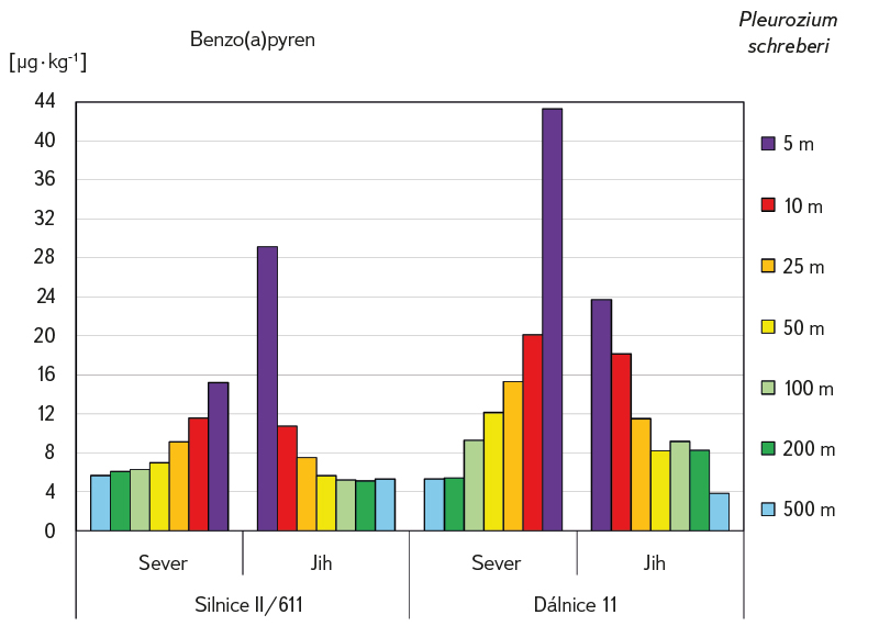 Sumy PAU v mechu u silnice II/611 klesají oboustranně zhruba do vzdálenosti 100 m a podobně u D11 sumy PAU klesají do vzdálenosti zhruba 200 m, ne dále. Uvedené distance jsou zřejmě hlavní depoziční zóny u sledovaných segmentů komunikací. Podobně jako v případě těžkých kovů, pevná bariéra v podobě půdního valu nebo vysokého náspu na jižním okraji II/611 a severním okraji D11 významně zpomaluje šíření aerosolů PAU do okolí komunikací a zvyšuje úroveň aktuálních spadů PAU u komunikací. Popsaná situace je názorně dokumentována na obr. 12 pro případ BAP. Sucharová a Holá [13] zjistily u dálnice D1 u Divišova v roce 2010 statisticky významně vyšší obsahy PAU v mechu do 50 m od dálnice. Zároveň zjistily velmi rychlé zvýšení obsahů PAU v mechu na referenčním místě vlivem pálení lesních zbytků po těžbě dřeva i ve velké vzdálenosti od odběru vzorku mechu [13].