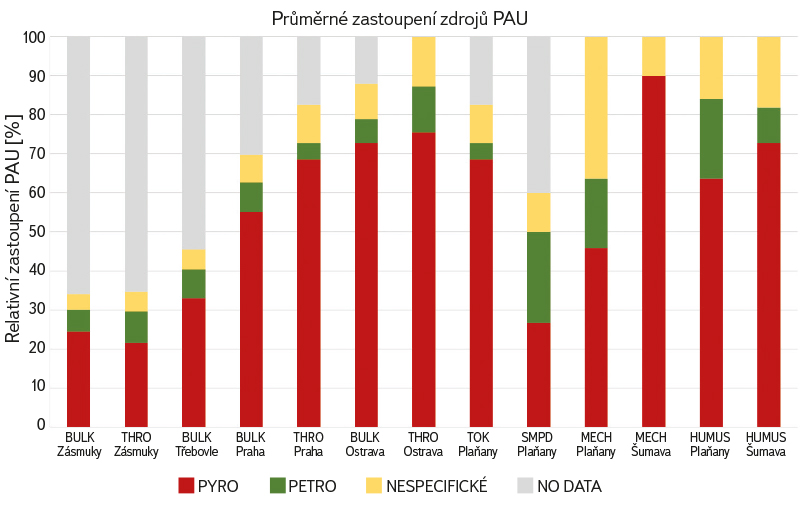 Obr. 13 zobrazuje průměrné zastoupení PAU ve vybraných matricích odebraných v povodí Výrovky, v Praze a Ostravě. Výpočet vychází z celkem devíti vybraných diagnostických poměrů PAU. Kategorie určující původ jsou: PYRO, PETRO, NESPECIFICKÉ (poměry vypočteny, nicméně neukazují jednoznačně na typ zdroje znečištění) a NO DATA (koncentrace pro výpočet poměrů byly pod mezí stanovitelnosti nebo nedostupné).