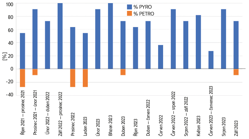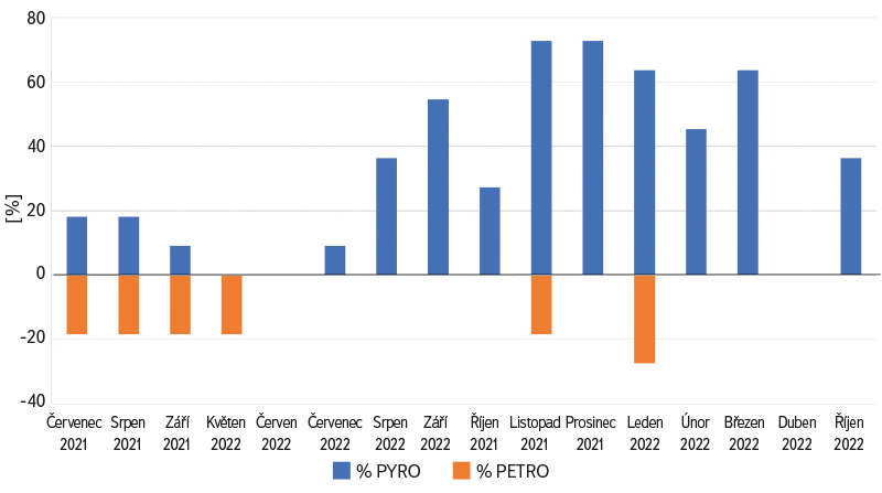 V případě významně nebo enormně znečištěných urbanizovaných lokalit bylo možné nejlépe specifikovat původ znečištění PAU (Praha, Ostrava). Byl potvrzen převládající pyrogenní původ PAU, a to i v Praze ve vzdálenosti cca 25 m od páteřní komunikace ulice Podbabská. Naopak v případě lokalit Zásmuky a Třebovle bylo množství hodnot u vybraných PAU pod mezí stanovitelnosti (MS) a metodu diagnostických poměrů bylo možné použít jen pro některé z nich. V takovém případě byl pro odhad původu použit poměr mezi sumou nízkomolekulárních a vysokomolekulárních PAU, jejichž koncentrace byly nad mezí stanovitelnosti (∑ LMW / ∑ HMW). Pokud je tento poměr menší než 1, lze usuzovat na pyrogenní původ, v opačném případě na petrogenní původ [21]. Na obr. 14 je zřejmý rozdíl původu PAU v celkové mokré depozici (bulk) na lokalitě Třebovle, přičemž měsíce netopné sezony jsou seřazeny v levé části grafu a měsíce topné sezony v pravé části grafu. Petrogenní a pyrogenní původ PAU v letních měsících byl téměř vyrovnaný, v chladném období roku převládal pyrogenní původ. V letních měsících byly koncentrace PAU nižší a častěji pod MS, proto bylo možné pro odhad jejich původu použít menší počet vzájemných poměrů jednotlivých PAU. Např. na rozdíl od zimních měsíců byly za období květen až červen 2022 nad MS pouze LMW uhlovodíky, které jsou především petrogenního původu. V grafu na obr. 15 je zastoupení zdrojů vyjádřeno procentuálně.