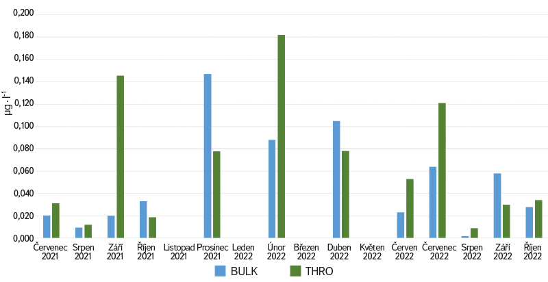 Koncentrace PAU v zachycené srážkové vodě se během roku značně liší (obr. 2). Z výsledků lze pozorovat trend znečištění srážek PAU v jednotlivých měsících a rozdíl v zimním a letním období. Na nárůst koncentrací PAU v zimě mají vliv především lokální topeniště v závislosti na meteorologických podmínkách. U jednotlivých sloučenin PAU převládají v atmosférických srážkách koncentrace fluoranthenu, fenanthrenu, pyrenu a benzo[a]pyrenu. Z porovnání koncentrace sumy PAU vyplývá, že jejich obsah je v podkorunové depozici throughfall (v obrázcích značeno THRO) většinou vyšší než v celkové depozici bulk (v obrázcích BULK). To je dáno vazbou PAU na jemné prachové částice (PM10, PM2,5), jež jsou následně deponovány na vegetaci. Z ní jsou pak smývány při atmosférických srážkách.