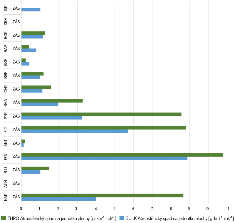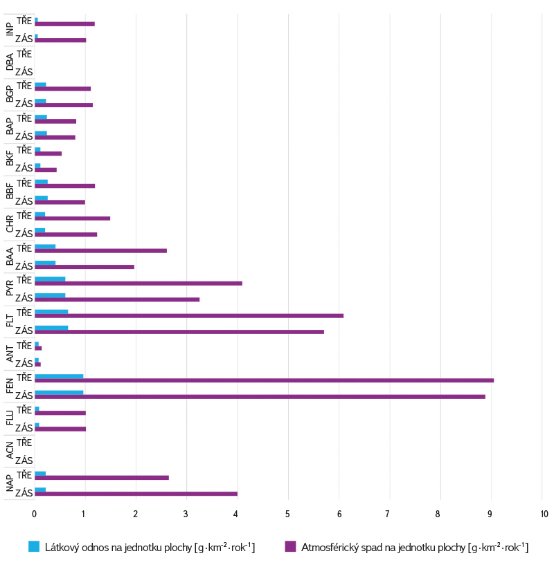 V následujícím kroku byla v povodí Výrovky vypočtena velikost atmosférického spadu PAU na jednotku plochy v g ∙ km-2 ∙ rok-1 pro celkovou a podkorunovou depozici. Nejvyšší je pro naftalen, fenanthren, fluoranthen a pyren. V grafu (obr. 3) na lokalitě Zásmuky je vidět rozdíl spadu mezi depozicí celkovou a podkorunovou u jednotlivých PAU. Je zajímavé, že v případě výše molekulárních PAU rozdíl není tak velký.