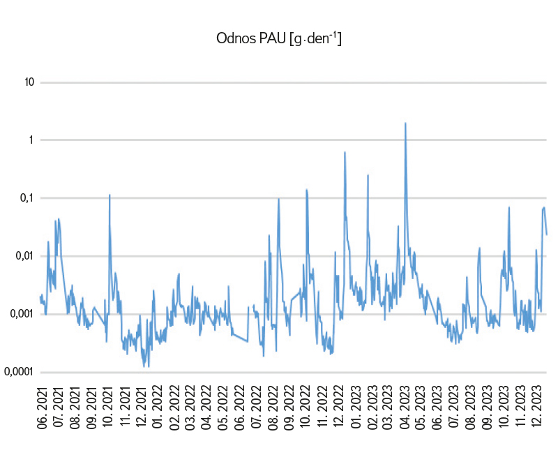 Obr. 5. Režim odnosu PAU v plaveninách v profilu Plaňany v období 2021–2023