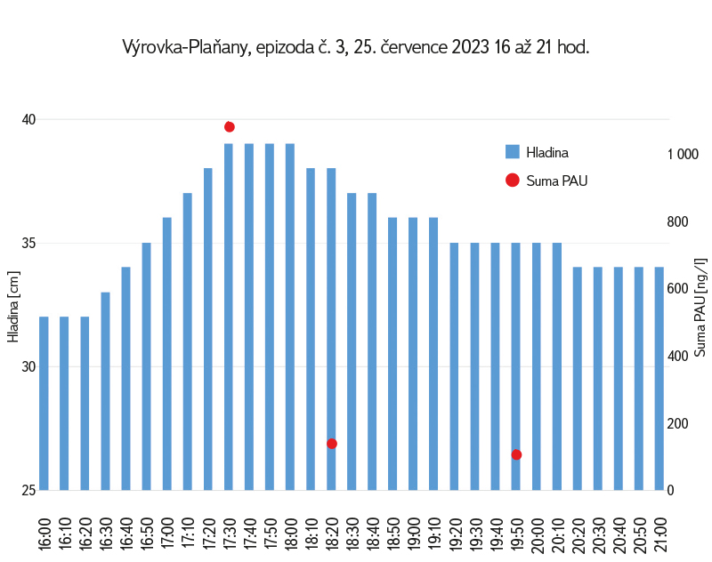 V roce 2022 bylo provedeno vzorkování povrchové vody v monitorovacím profilu ČHMÚ Výrovka-Plaňany během tří srážkoodtokových epizod. Vzorkování probíhalo pomocí dálkově ovládaného automatického vzorkovače. Úhrn srážek v klimatologické stanici KS Cerhenice byl nejvyšší při třetí vzorkovací epizodě 29. června 2022, kdy během dvou hodin (16:10 až 18:10 hod.) spadlo 38,9 mm srážek. Během této srážkoodtokové události byly provedeny tři dílčí odběry vody, jak dokumentuje obr. 6. První odběr byl proveden při maximální dosažené hladině v recipientu, další dva v sestupné fázi průtoku. PAU byly stanoveny v homogenizovaném vzorku. Koncentrace PAU byla maximální v době kulminujícího průtoku (1 078 ng ∙ l-1). Následně se jejich koncentrace významně snížila na 139 až 106 ng ∙ l-1. Pro srovnání, průměrná roční koncentrace Σ PAU z měsíčních odběrů v profilu Výrovka-Plaňany činila 57 ng ∙ l-1. Odnos PAU během tříhodinového zvýšeného průtoku v recipientu (17 až 20 hod.) byl odhadnut na 1,13 g. V tento den šlo o největší srážkový úhrn v roce 2022. Následovalo dalších sedm dní se srážkovým úhrnem nad 25 mm. Přestože tedy koncentrace PAU při srážkoodtokových epizodách významně roste, zvláště v její počáteční fázi, celkový odnos z povodí sice rovněž vzroste, avšak zdaleka nedosahuje hodnot atmosférického spadu na celkovou plochu povodí.