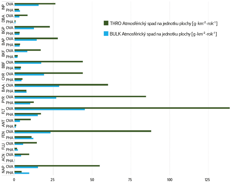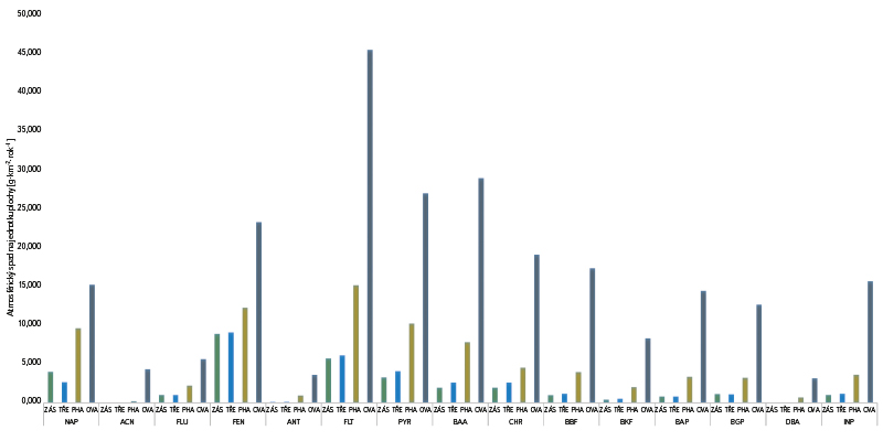 Výsledky v tab. 4 a obr. 8 dokazují, že lokalita Ostrava-Přívoz je enormně zatíženým územím z hlediska emisí PAU. Vzhledem k tomu, že se tam prakticky nevyskytují lokální topeniště spalující pevná nebo kapalná fosilní paliva, souvisí tato zátěž s intenzivní průmyslovou činností a v menší míře se zvýšenou hustotou dopravy v této oblasti. Zátěž PAU na lokalitě Praha-Podbaba je oproti Ostravě-Přívozu výrazně nižší, avšak ve srovnání s lokalitami v povodí Výrovky více než dvojnásobná. Na relativně vysokých hodnotách spadu PAU v Praze se s vysokou pravděpodobností podílí hustota dopravy přilehlé páteřní komunikace, případně další zdroje. Zásmuky a Třebovle vykazují nižší a téměř shodnou úroveň emisí PAU, což může být dáno menší hustotou městských sídel, průmyslu a nižším dopravním zatížením. Lokalita Třebovle v dolní části povodí Výrovky je o něco více zatížena spadem PAU než lokalita Zásmuky, umístěná v lesním porostu mezi obcemi Zásmuky a Barchovice. Hodnota celkového spadu PAU v Ostravě-Přívoze je přibližně 7,6krát vyšší než na lokalitě Třebovle.