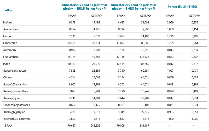 Tab. 3. Celkový atmosférický spad PAU na lokalitách Ostrava-Přívoz a Praha-Podbaba