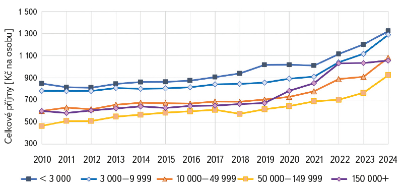 Dlouhodobě se ukazuje, že tyto příjmy na obyvatele jsou nejvyšší v nejmenších obcích a klesají s růstem velikosti obcí pouze s výjimkou největších obcí (obr. 10). V období 2021–2024 se příjmy ve všech velikostních kategoriích obcí zvýšily průměrně o jednu třetinu. Vzhledem k podílu složek uvedeného ukazatele celkových příjmů působí na tento výsledek zejména velikost místního poplatku za odpady.