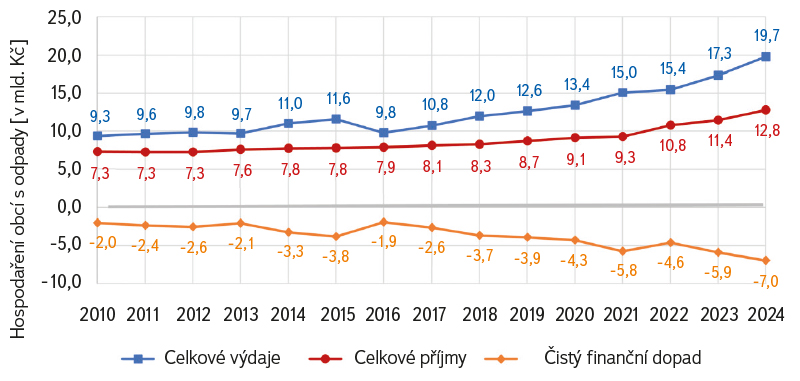V rámci rozpočtů obcí je hospodaření s odpady podchyceno pomocí příjmů a výdajů a finančních vztahů mezi nimi. Ty jsou blíže upřesněny prostřednictvím položek, paragrafů apod., jež jsou sledovány dle struktury rozpočtové skladby podle vyhlášky č. 412/2021. Zachycení finančních vztahů v rozpočtu souvisí s modely hospodaření obcí s odpady. Tyto finanční vztahy odrážejí odlišné modely hospodaření obcí – od samostatného zajišťování činností obecním úřadem přes nákup služeb od svozových firem až po zakládání městských organizací nebo spolupráci v rámci svazků obcí. Volba modelu závisí zejména na velikosti obce, organizačních kapacitách a ekonomické stabilitě. Z dlouhodobého hlediska lze pozorovat výrazný růst zatížení obecních rozpočtů odpadovým hospodářstvím. Zatímco v roce 2010 to byly 2 mld. Kč, v roce 2024 šlo již o 7 mld. Kč, což představuje nárůst o 241 %. Celkové čisté finanční dopady nakládání s odpady v obcích jsou dány zejména růstem výdajů obcí v odpadovém hospodářství. Od roku 2010 do roku 2024 celkové výdaje obcí na hospodaření s odpady vzrostly z 9,3 mld. Kč na 19,7 mld. Kč, tento nárůst o 111 % byl ovlivněn inflací, ale i po jejím očištění stále zůstává nárůst o 29 % (obr. 8).
