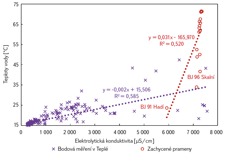 Analýzou dat byla zjištěna korelace mezi konduktivitou vody v definované síti a teplotou s koeficientem determinace R² = 0,585. Koeficient je sice velmi podobný i pro již zachycené prameny (R² = 0,520), rozložení hodnot je však zcela odlišné. Hadí pramen je totiž jediný zachycený pramen, který má zřetelně odlišnou konduktivitu. Jde o nejvzdálenější vývěr od středu struktury, o pramen s nejvyšší koncentrací v. r. CO₂ a je také nejchladnější (obr. 8). Lze ho tak vyloučit ze souboru dat. Analogicky k divokým vývěrům minerálních vod lze tedy konstatovat, že fakticky teplota vody není vhodným prekurzorem pro určení konduktivity, neboť v případě zamezení ředění Teplou bude konduktivita pro všechny nové divoké vývěry shodná, tj. ± 7 300 µS/cm, zatímco teplota vody se bude lišit v závislosti na rychlosti výstupu termy.