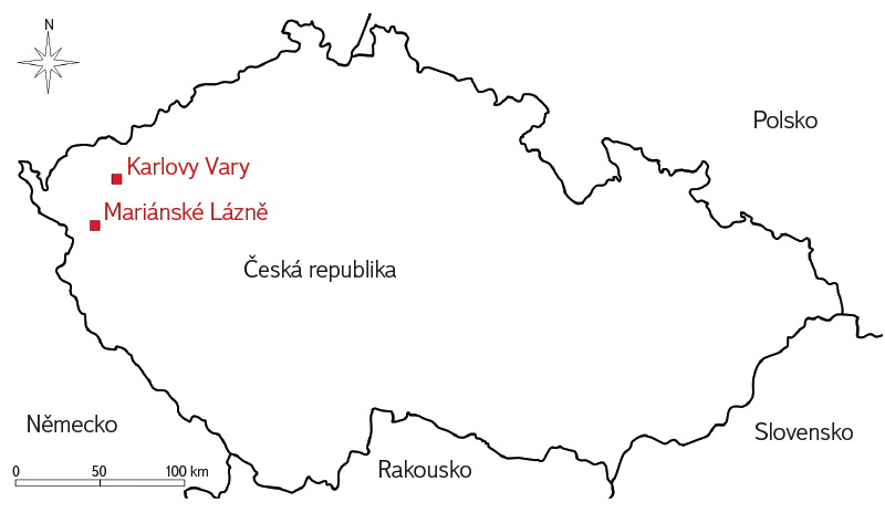 Hlavním cílem termometrického průzkumu jak v Mariánských Lázních, tak v Karlových Varech (obr. 1) bylo nalézt dosud neznámé vývěry minerálních vod. Znalost distribuce minerálních pramenů v prostoru je klíčová pro vhodné nastavení preventivní i reparativní ochrany, a to i pro již zachycené a exploatované vývěry. Dílčím cílem bylo popsat specifika využití termometrie při průzkumu vývěrů minerálních vod, přičemž byly záměrně termometrovány dvě kontrastní lokality, aby se ověřila aplikovatelnost v širším spektru podmínek. Oblast Mariánských Lázní je značně prostorově rozsáhlá a charakteristická pro své vývěry studených minerálních vod obohacených o volné rozpuštěné (dále v. r.) CO₂, zatímco oblast Karlových Varů je úzce omezená a typická pro vývěry vod termálních. Mariánské Lázně byly vybrány proto, že vyhledávání studených minerálních pramenů zvyšuje nároky na použitou techniku, což v konečném důsledku vede k vyšší vypovídající hodnotě výsledků testování termometrie při vyhledávání minerálních pramenů. Podcíle byly pro každou lokalitu stanoveny samostatně.