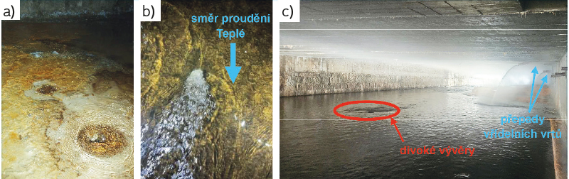 Obr. 2. Divoké vývěry karlovarské termy; a) divoké vývěry ve starém suterénu Vřídla, b) divoké vývěry do koryta Teplé, c) celkový pohled pod přemostění s patrnými divokými vývěry