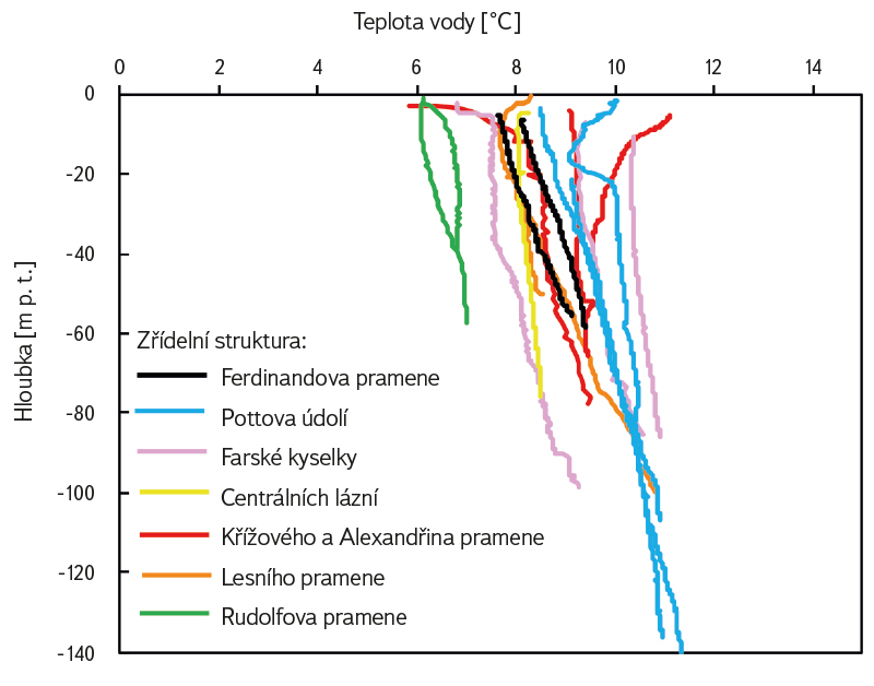 Obr. 3. Změna teploty vody s hloubkou v exploatovaných vrtech na minerální vodu v jednotlivých zřídelních strukturách Mariánských Lázní (upraveno z [21])