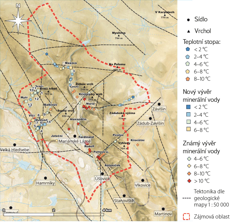 V zájmové oblasti (obr. 4) byly nejprve dohledány vodoteče ze Základní báze geografických dat České republiky (ZABAGED). Samotný termometrický průzkum probíhal od ledna do března 2023 a k termometrii byla využita TIR kamera FLIR C5 (USA) umožňující měřit v rozsahu -20 °C až +400 °C se snímací frekvencí 8,7 Hz a rozlišením 240 × 320 pixelů v základním režimu nastavení, tj. s automatickou kalibrací. Sled činností po identifikaci teplotní stopy neznámého charakteru zahrnoval označení kolíkem, fotodokumentaci, GPS zaměření mobilním telefonem, dále měření konduktivity, teploty, hodnoty pH pomocí přístroje WTW Multi 340i se sondou TetraCon 325 a pH-Elecrode SenTix 41 a nakonec vydatnosti a koncentrace v. r. CO₂ Härtlovým přístrojem. Ačkoli byly zaměřeny všechny nalezené teplotní stopy, odběr pro chemickou analýzu probíhal pouze u těch stop, u nichž byla zjištěna přítomnost v. r. CO₂ Härtlovým přístrojem, tedy u nových vývěrů minerální vody. Nejvýznamnějším novým vývěrům minerální vody dle vydatnosti a obsahu v. r. CO₂ byly přiděleny kromě identifikačního čísla i jména v souladu s názvy okolních pramenů. Pro lepší lokalizaci byly teplotní stopy v březnu až dubnu 2023 zaměřeny RTK (Real-Time Kinematic) GPS stanicí. Následně byla provedena interpretace a data konfrontována s teplotami a elektrickými konduktivitami již zachycených minerálních pramenů, a to s vědomím, že teplota vody v exploatovaných „minerálkových“ vrtech roste s hloubkou průměrně o 1,6 °C / 100 m (obr. 3) a některé jímací objekty mají přetok, což interpretativnost ještě dále snižuje. Všechny nové vývěry minerální vody byly pravidelně sledovány do července 2024, aby se ověřilo, že nejsou přechodného charakteru.