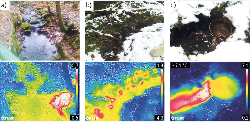 Fig. 5. Thermal camera images; a) Lucčina kyselka, b) small springs in the river floodplain, c) Žabí kyselka springing outside the spring catchment