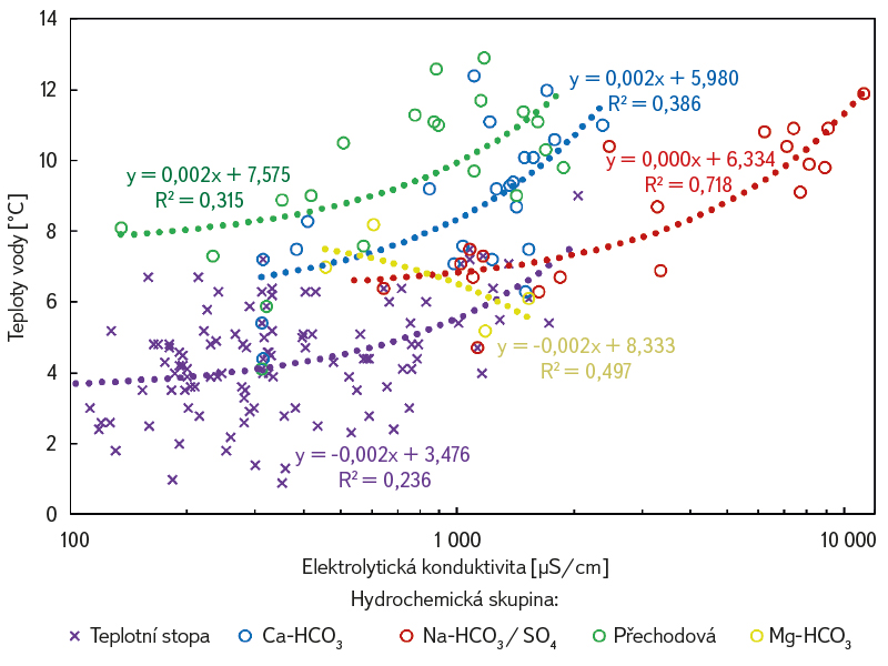 Doplňkovým měřením konduktivity teplotních stop nebyla zjištěna dobrá korelace s teplotou (obr. 6). Mírně lepší korelaci vykazuje soubor dat nových i stávajících vývěrů minerální vody rozdělených do hydrochemických skupin. Obecně však platí, že teplota vody není vhodným prekurzorem pro odhad konduktivity. Nejvyšší koeficient determinace, tj. R² = 0,718, vykazuje skupina Na-HCO3 / SO4, ostatní skupiny mají determinační koeficient výrazně nižší (R² = 0,315 a 0,386). Jediná skupina Mg-HCO3 (R² = 0,497) vykazuje klesající teplotu s rostoucí konduktivitou. Soubor dat je však omezen pouze na čtyři vývěry. Bylo zjištěno, že vyšší vydatnost pramenů způsobuje nižší roční rozkolísanost teploty vody.