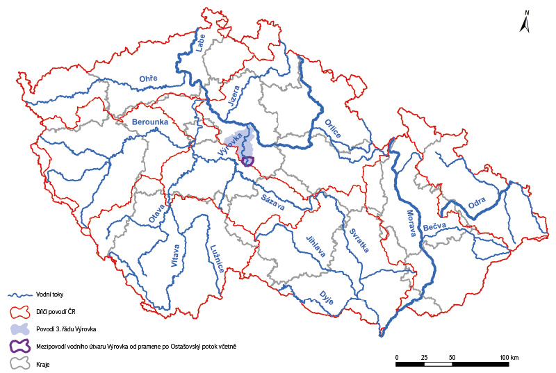 Řešené území je ohraničeno mezipovodím útvaru povrchových vod HSL_2620 „Výrovka od pramene po Ostašovský potok včetně“ na ploše 57,364 km2. Tento vodní útvar, resp. jeho mezipovodí, spadá do povodí 3. řádu 1-04-06 Výrovka a je lokalizován na rozvodí dílčích povodí Horní a střední Labe a Dolní Vltava v Mezinárodním povodí Labe (obr. 1). Výrovka pramení v Kochánově v nadmořské výšce 492,5 m, celková délka tohoto vodního toku je 61,9 km a je levobřežním přítokem Labe u obce Písty na Nymbursku v nadmořské výšce 181 m. Z útvaru povrchových vod HSL_2620 Výrovka odtéká, resp. vtéká do Vavřineckého rybníka, na 52,7 řkm, tzn. 19,2 km od pramene. Dle řádu vodních toků podle Strahlera je zde řeka Výrovka v 5. řádu [1–3].