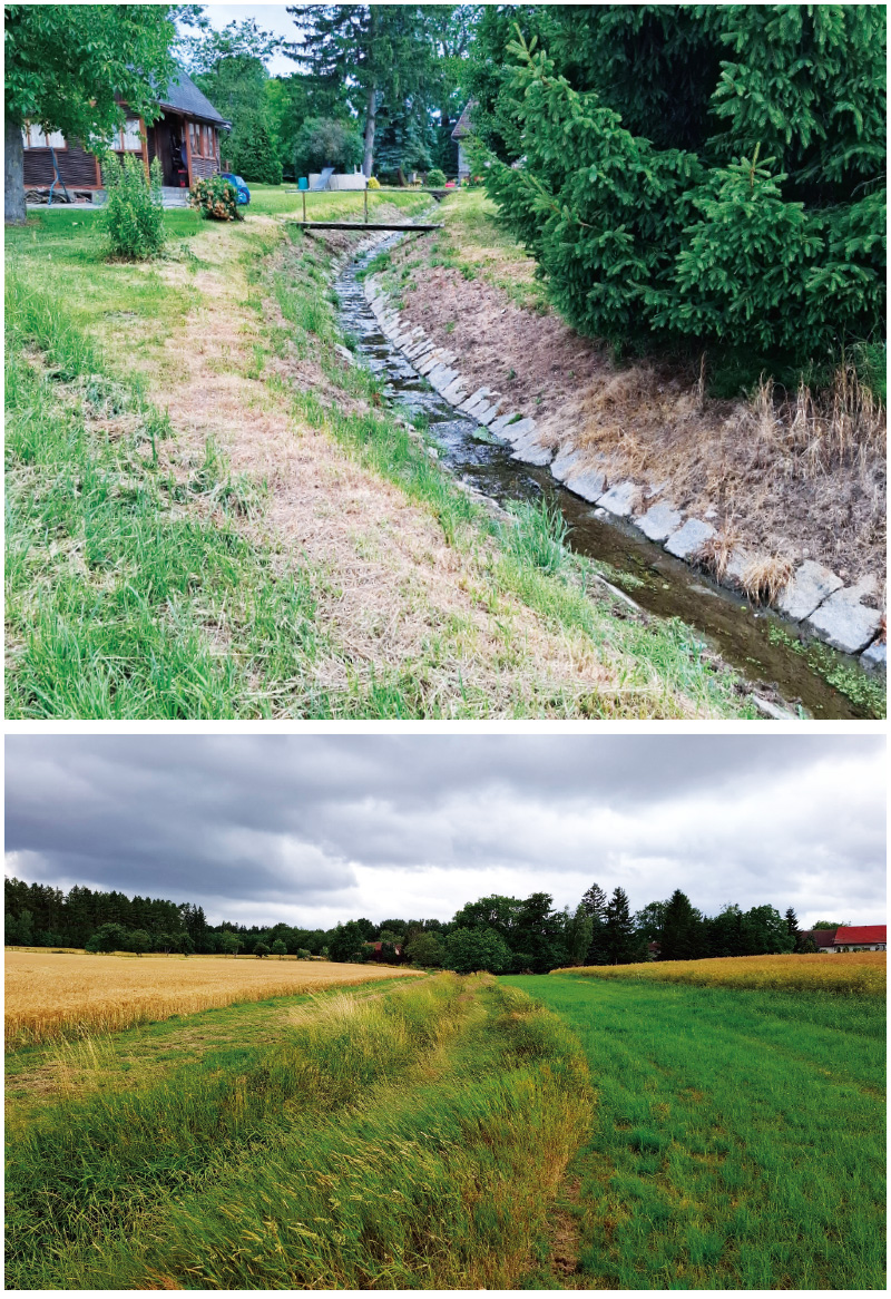 Obr. 5a, b. Současný stav krajiny v pramenné oblasti Výrovky (červenec 2025)