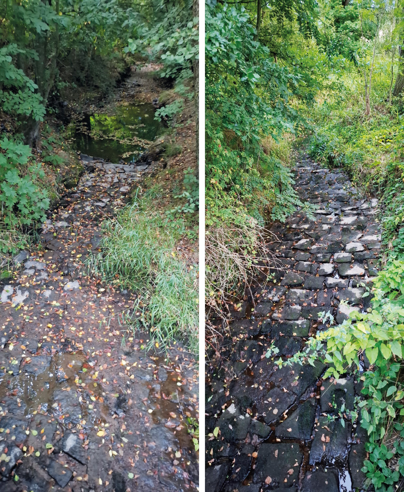 Fig. 11a, b. Dried-up riverbed of the Výrovka at the confluence with Anenský stream (September 2025)
