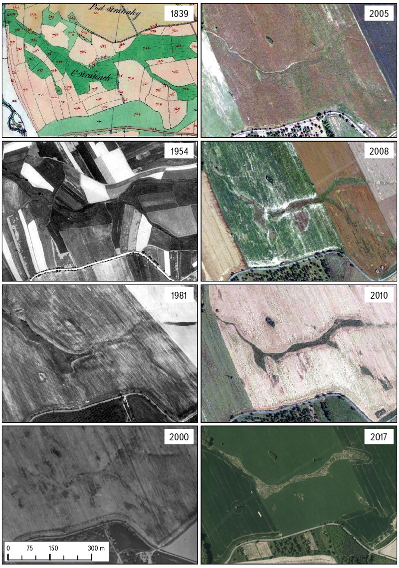Obr. 12. Sukcesní obnova odvodněné lokality „U Stratinek“ na mapě stabilního katastru (1839), Historické ortofotomapě z padesátých let 20. století a na archivních ortofotomapách