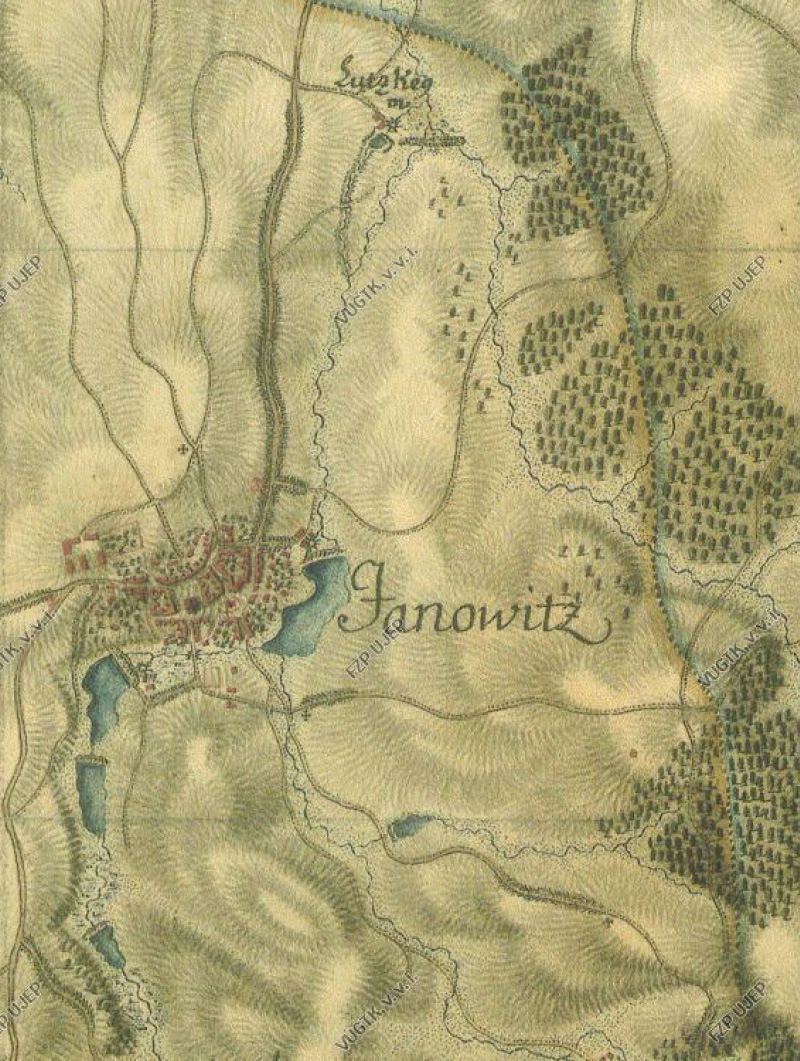 Fig. 16. Landscape in the area of Uhlířské Janovice village, including the former Lucký mill, on the 1st Military Mapping