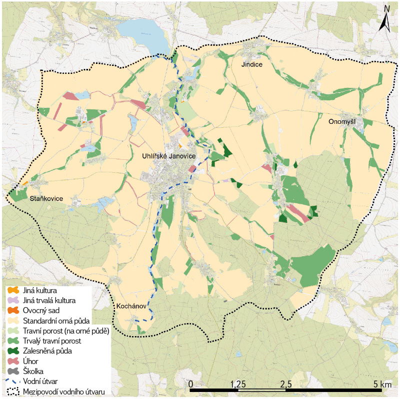 V řešeném mezipovodí je podle ZABAGED® [9] dominantním typem orná půda a ostatní plochy – 3 390,48 ha (59, 10 %), významnými typy jsou ještě lesní půda se stromy – 1 273,47 ha (22, 20 %) a trvalý travní porost – 549,49 ha (9,58 %). Menší část pak tvoří ovocné sady a zahrady – 234, 83 ha (4,09 %) a sídelní plochy – 108, 58 ha (1,90 %). Vodní plochy zaujímají pouze 0,81 % tohoto povodí. Minimální je zastoupení křovin (0,40 %), mizivě se vyskytují bažiny a močály na trvalém travním porostu, resp. na lesní půdě se stromy (0,04 %, resp. 0,05 %).