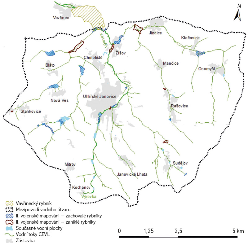 Při interpretaci vývoje vodních ploch nebyl rozlišován způsob jejich využití z důvodu různých přístupů k definici rybníka v minulosti a v současnosti. Nyní se v krajině vyskytuje velké množství typů vodních ploch podle využití a zároveň existují rozdíly mezi hospodařením na vodních plochách, které jsou označeny jako rybníky. Historicky byly za rybníky považovány všechny uměle vytvořené vodní plochy opatřené hrází nebo vyhloubené lidskou činností, přičemž v polovině 19. století se ještě přesně nevymezoval rozdíl mezi nádrží (požární, hospodářskou apod.) a rybníkem (vodní plochou určenou výhradně pro chov ryb). Z tohoto hlediska tedy lze všechny vodní plochy zakreslené na mapách II. vojenského mapování, resp. Císařských otiscích stabilního katastru, považovat za rybníky [16, 17].
