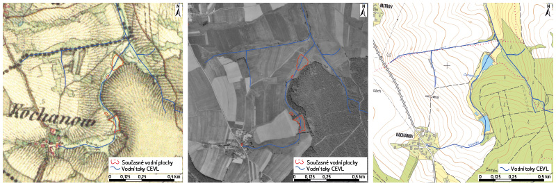 Současný stav krajiny je zaznamenán na aktuální Základní topografické mapě ČR 1 : 10 000 (ZTM 10) a aktuální Ortofotomapě ČR. Ty jsou dostupné jako WMS z Geoportálu ČÚZK [14]. Pro následné analýzy byly použity pouze historické vodní nádrže/rybníky s minimální rozlohou 0,1 ha. Ke zpřesnění krajinného vývoje mezi situací na mapě II. vojenského mapování (pro tuto lokalitu zaznamenán její stav kolem roku 1852) a současným stavem byla použita historická ortofotomapa z padesátých let 20. století. Prohlížet ji lze na Národním geoportálu INSPIRE [11], zde je zároveň jako WMTS [12]. Dále byly použity archivní ortofotomapy, jež jsou dostupné jako WMS na Geoportálu ČÚZK, nyní z let 1998–2022 [14].