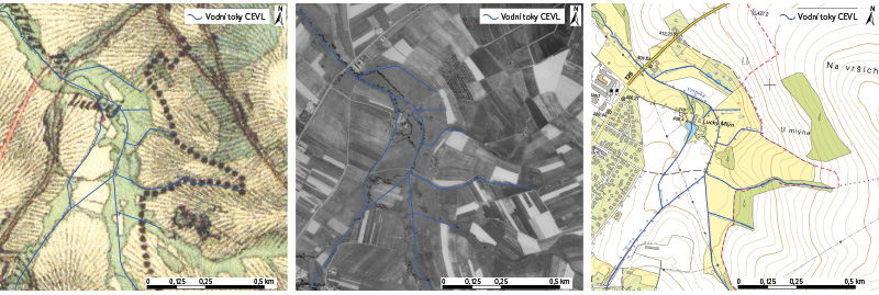 Fig. 4. Landscape changes in the Výrovka spring area, based on the 2nd Military Mapping (1852), historical orthophotomap from the 1950s, and BTM 10 (2024)