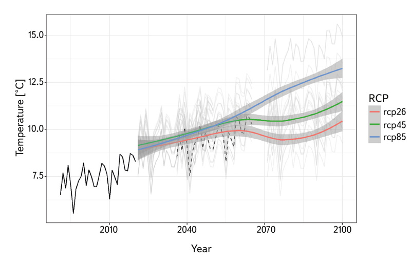 Fig. 4. Air temperatures according to observations, individual GCM and emission scenarios RCP (grey lines describe the simulations of individual climate models, coloured lines the mean of simulations for the selected emission scenario)