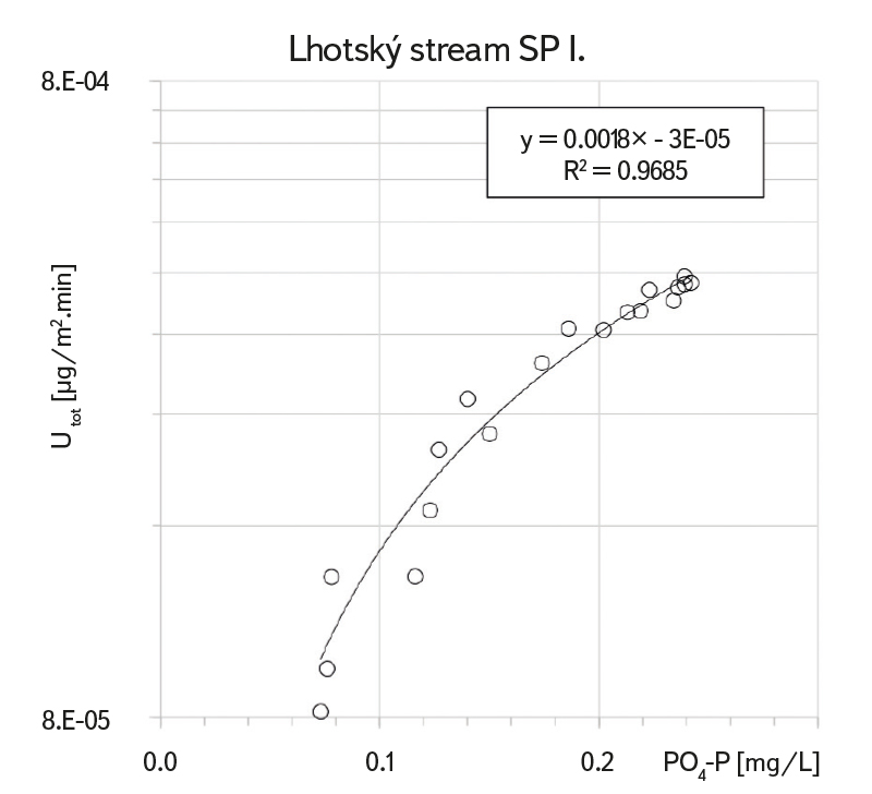 In methodology, the latest innovation is thus TASCC method (Tracer Additions for Spiraling Curve Characterization) [16], where the response on a known section of the watercourse is induced only by a one-time addition (slug injection) of a mixture of enriching nutrients and a conservative marker. Unlike the previous methods, each sub-sample taken from the resulting wave is used to calculate one particular value, i.e. the derivation of three spiraling metrics (SW, U a vf); it does not only take place by interpolating two or three points (corresponding to two or three steady-state concentrations), but by calculating a regression line over a large set of points. Such a procedure not only leads to higher statistical reliability, but mainly to higher factual accuracy of the calculated spiraling parameters characterizing nutrient retention (in our case phosphorus retention).